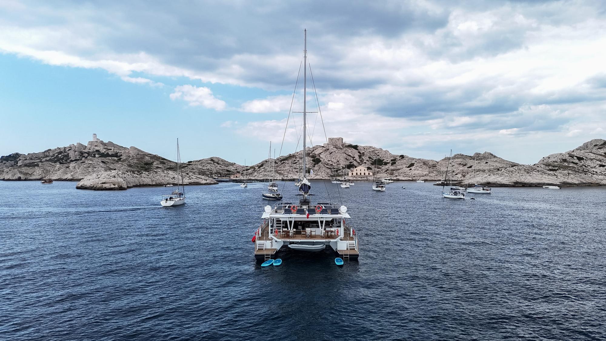 Discover Marseille from a whole new perspective, by sea. Departing from the Old Port, step aboard our maxi-catamaran Samba for an immersive morning cruise along the Marseille coastline. Throughout the guided navigation, spectacular cliffs, the village of Les Goudes, Île Maïre, the Frioul Archipelago and the iconic Château d’If reveal themselves from a privileged viewpoint. The crew’s stories and anecdotes bring the landscapes to life and uncover Marseille’s rich maritime history. A swim stop in crystal-clear waters completes the experience, with paddleboarding, snorkelling and an aperitif (planter's punch) served on board. An enriching and refreshing escape, ideal for understanding, admiring and truly experiencing Marseille from the sea. All inclusive: nothing to add on board, just enjoy the moment!