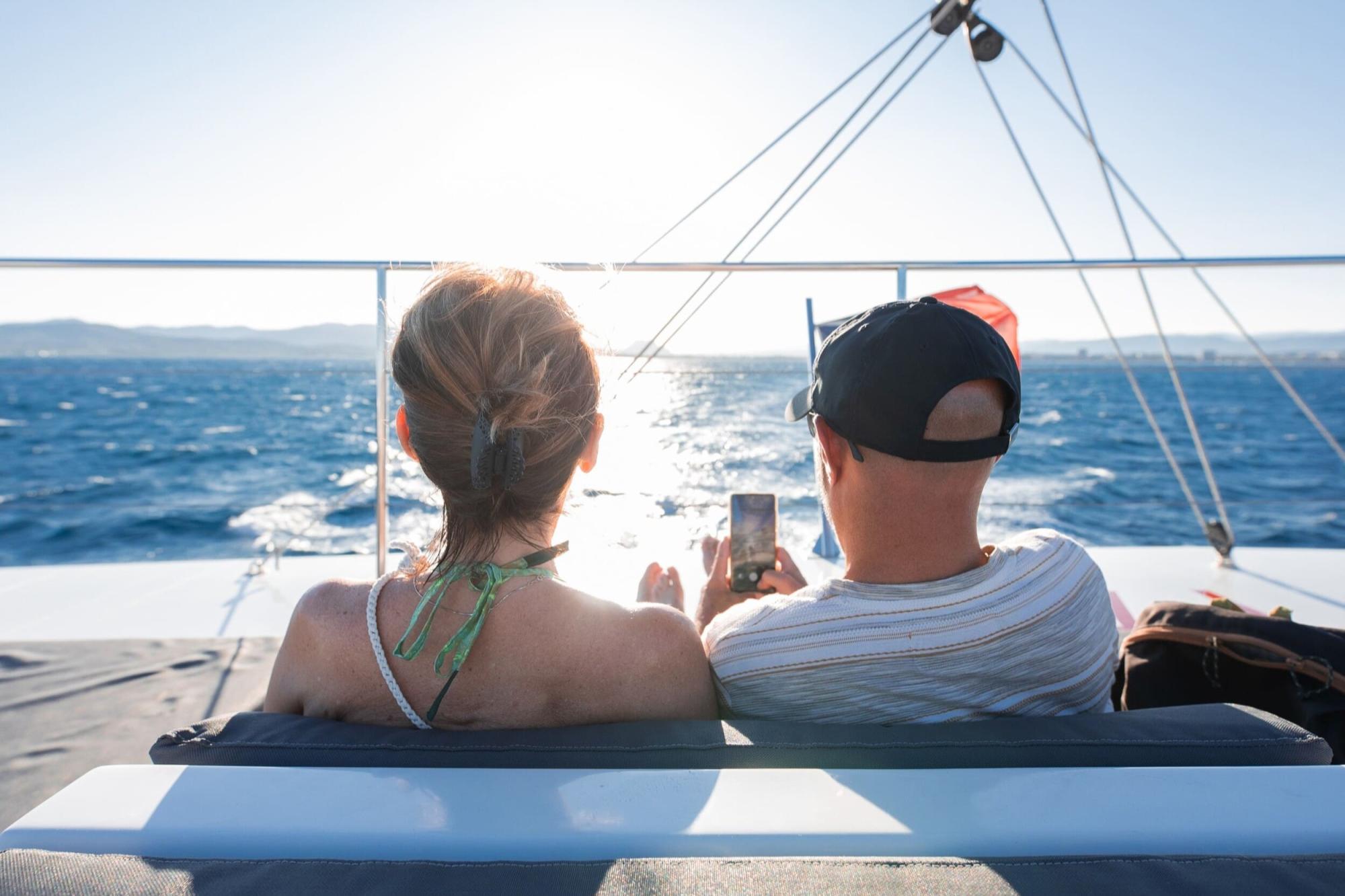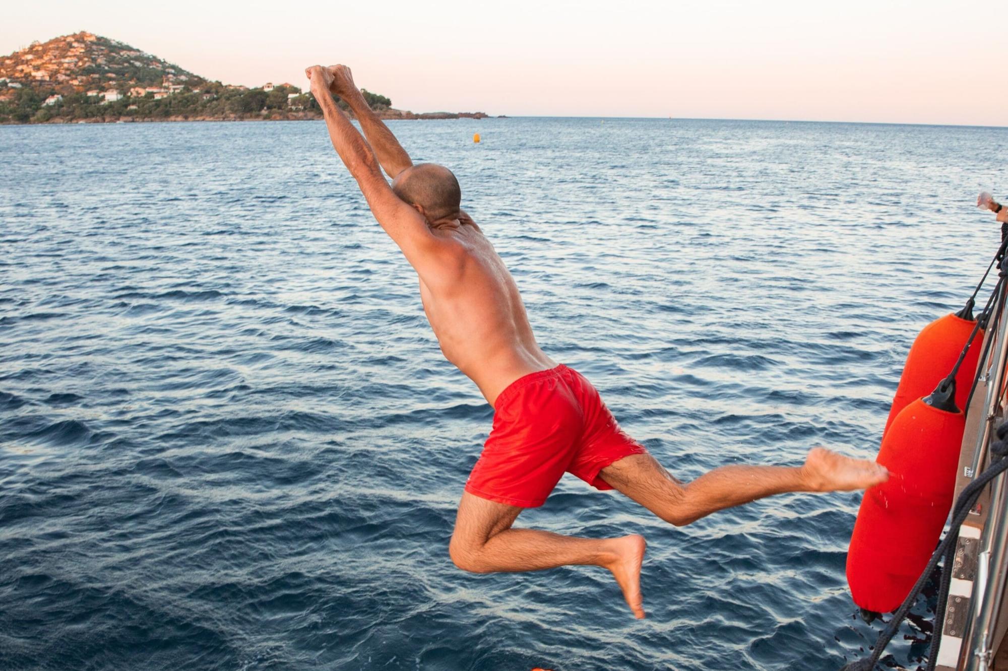 Vivez le coucher de soleil en mer au départ de Saint-Raphaël. En fin de journée, embarquez à bord de l’un de nos maxi-catamarans et prenez le large vers l’Île d’Or et le Cap Dramont, baignés par les lumières changeantes du soir. Le catamaran jette l'ancre face à ces paysages emblématiques : paddles, snorkeling ou détente sur les filets, chacun savoure l’instant à son rythme. Un apéritif (punch planteur) vous est proposé à bord tandis que le ciel se teinte progressivement de nuances dorées. La navigation retour prolonge la magie, dans une ambiance conviviale et décontractée. Tout inclus : rien à ajouter à bord, juste à profiter !